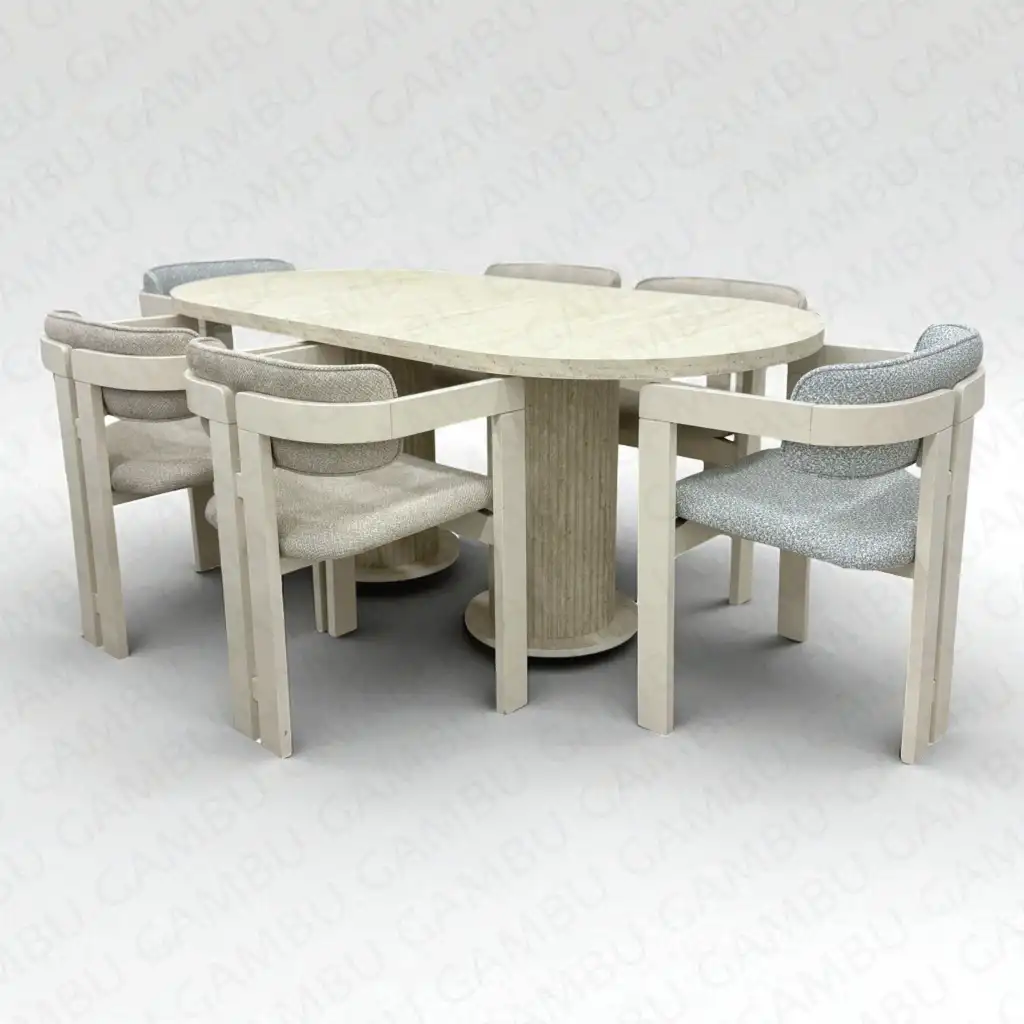 Bohem Masa Sandalye Takımı, zarif T sandalye tasarımı ile traverten desenli masa tablasını bir araya getirerek doğal ve modern bir görünüm sunar. Krem renkli sandalyeler, konforlu oturumu ve şık detaylarıyla dikkat çekerken, traverten desenli masa üstü ve ayakları mekânlara sofistike bir hava katar. Hem ev hem de ticari mekânlarda rahatlıkla kullanılabilecek bu takım, estetik ve işlevselliği bir arada sunar.