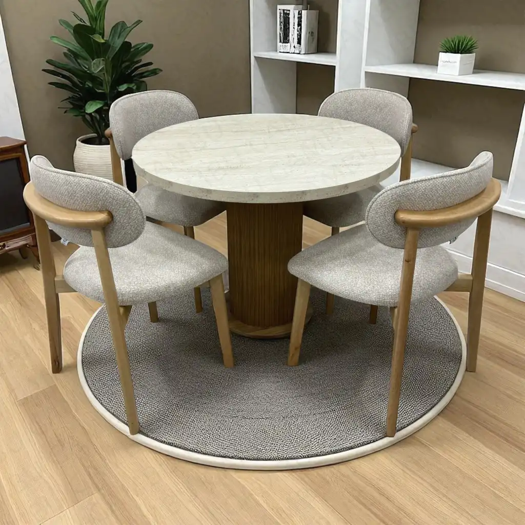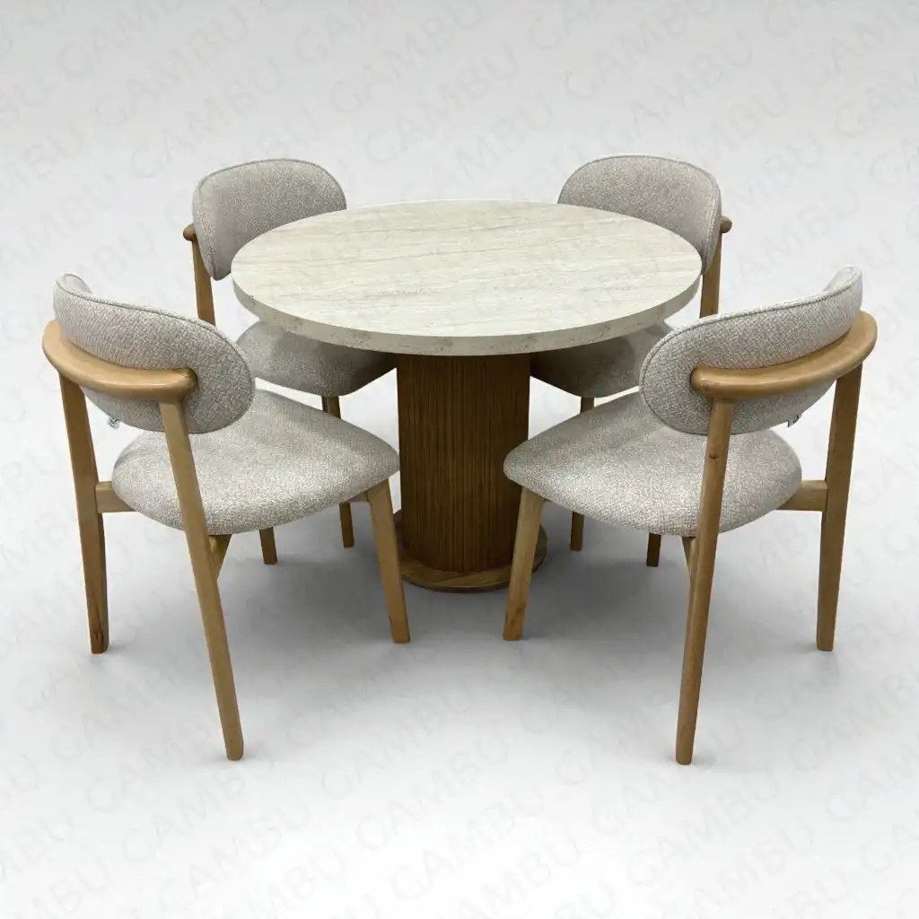 Yuvarlak Bohem Takım, doğal dokularla modern estetiği bir araya getiriyor. Norte naturel ahşap sandalyelerin zarif tasarımı, traverten desenli yuvarlak masa tablası ve naturel ayaklarla mükemmel bir uyum yakalıyor. Hem ev hem de ticari mekânlarda kullanılabilecek bu takım, doğallığı ve şıklığı bir arada sunarak yaşam alanlarına sıcak bir atmosfer katıyor.