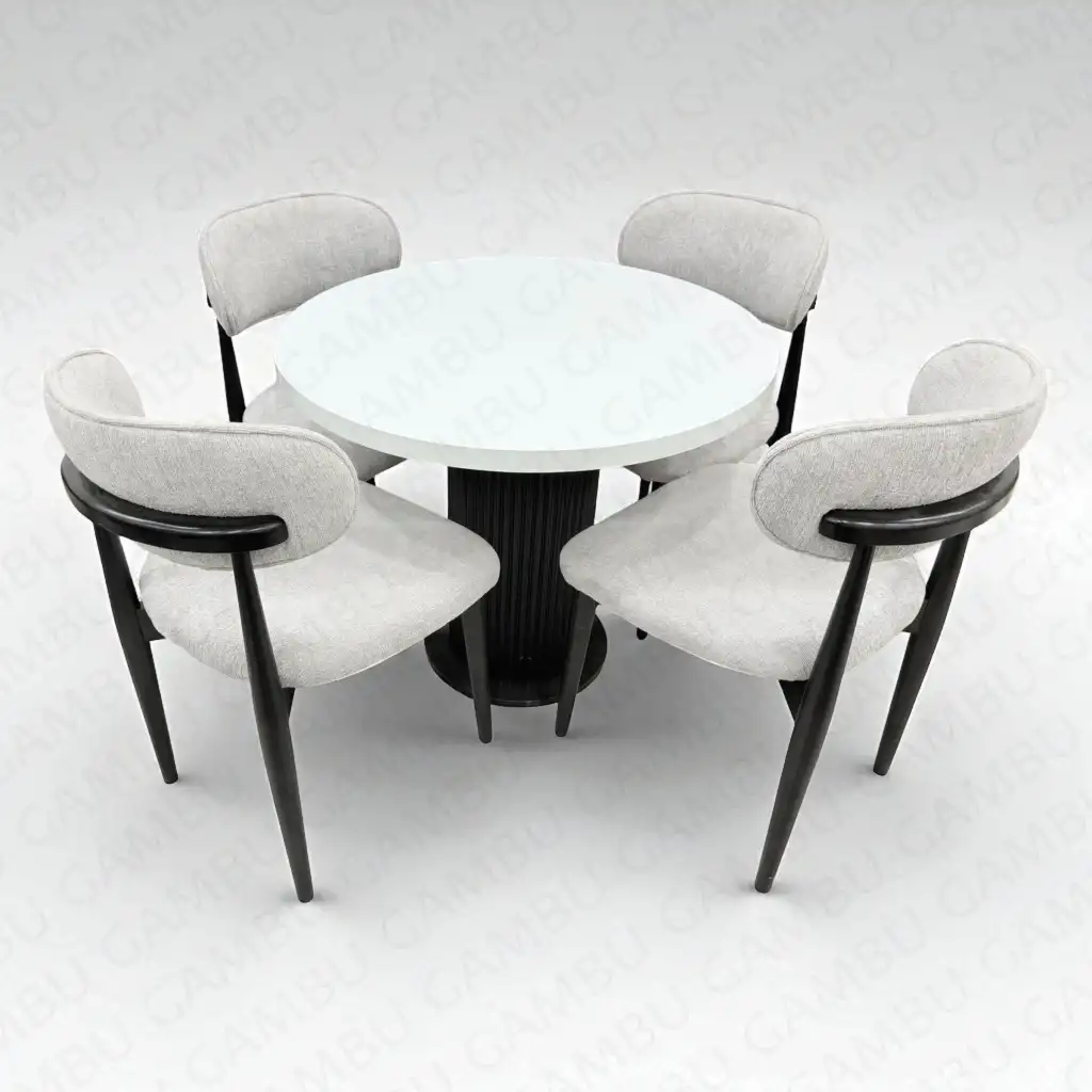 Yuvarlak Bohem Takım, modern çizgileri ve uyumlu renk kombinasyonu ile yaşam alanlarına şıklık katıyor. Takımda yer alan Polo siyah ahşap sandalyeler, dayanıklı yapısı ve ergonomik tasarımı ile uzun süreli konfor sağlar. Seti tamamlayan bohem yuvarlak masa, beyaz üst tablası ve siyah ayaklarıyla hem estetik hem de modern bir görünüm sunar. Ev, kafe ve restoran dekorasyonlarına zarafet ve işlevsellik katan bu takım, sade ve şık tasarımıyla öne çıkıyor.